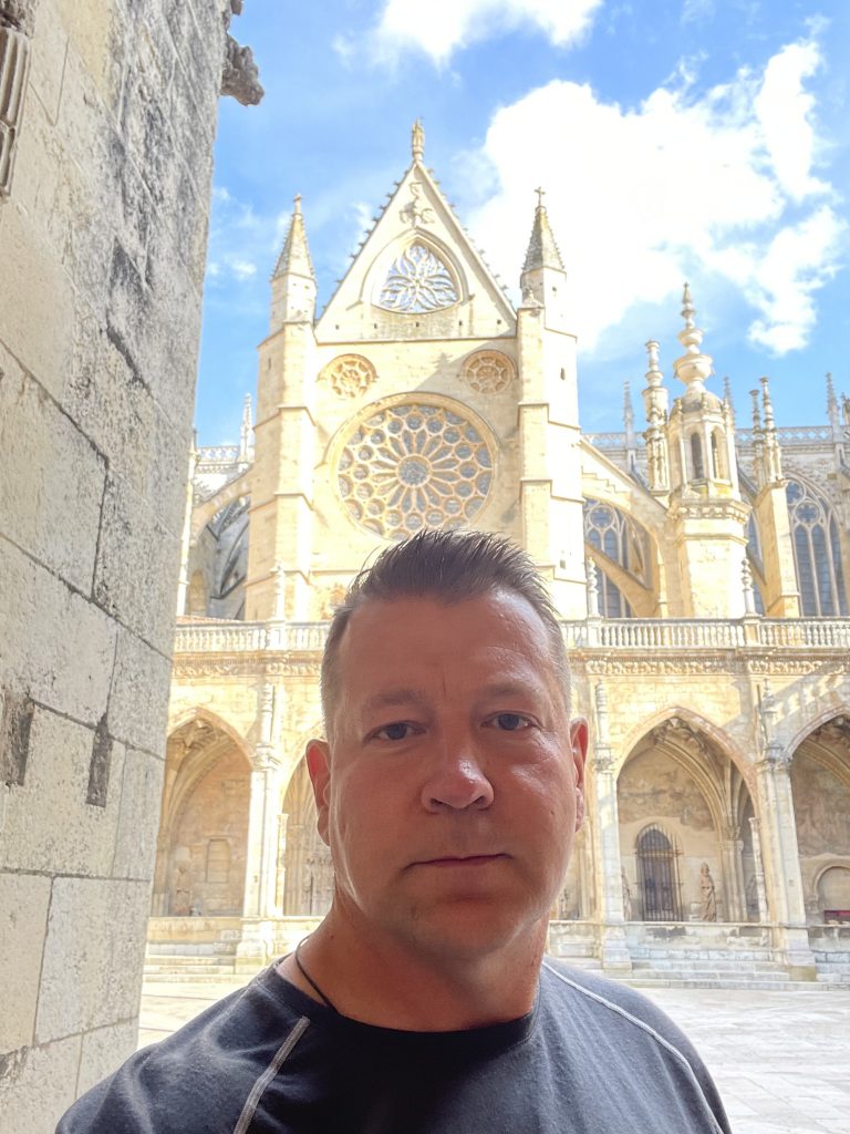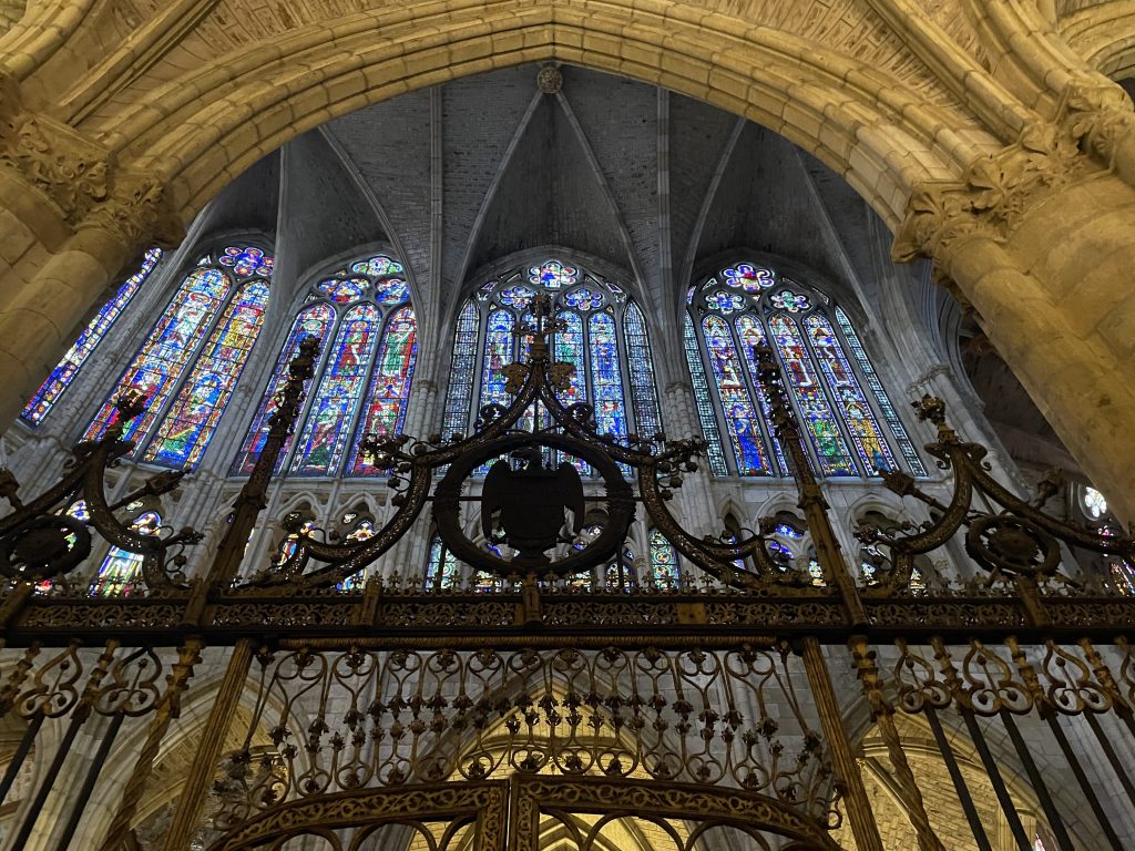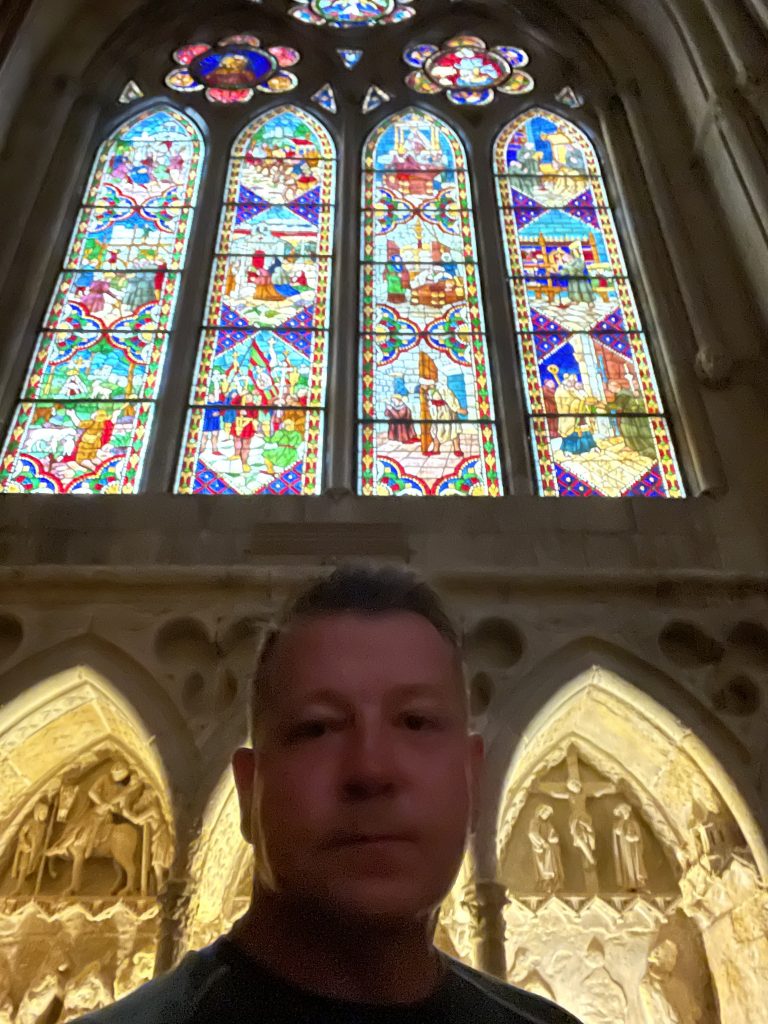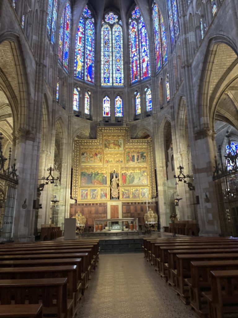 Davon werde ich ihm morgen erzählen. Hab das besser nicht ins Verhältnis zum Anfangsgewicht gesetzt. Zum Glück beherrscht der Drecksack keine Prozentrechnung. Danach sah ich mir noch die beeindruckende Kathedrale von innen an, die auch ein Museum zu bieten hatte. Natürlich wieder für 10 EUR Eintritt. Die bunten Glasfenster, die sich über einer Fläche von insgesamt 1.800 Quadratmeter erstrecken, waren wirklich spektakulär. Und, wie sollte es anders sein, traf ich Tana und Raul, die sich unabhängig voneinander genau den gleichen Zeitpunkt zur Kathedralenbesichtigung ausgesucht haben. Es gibt hier so viele Zufälle, das ist schon unheimlich. Wir gingen wieder zusammen essen in einer echt leckeren Tapas Bar. Diesmal ohne das kulturelle Nachtangebot zu nutzen, zumindest nicht so intensiv. Morgen sind es 25 KM und wieder 30 Grad angesagt.