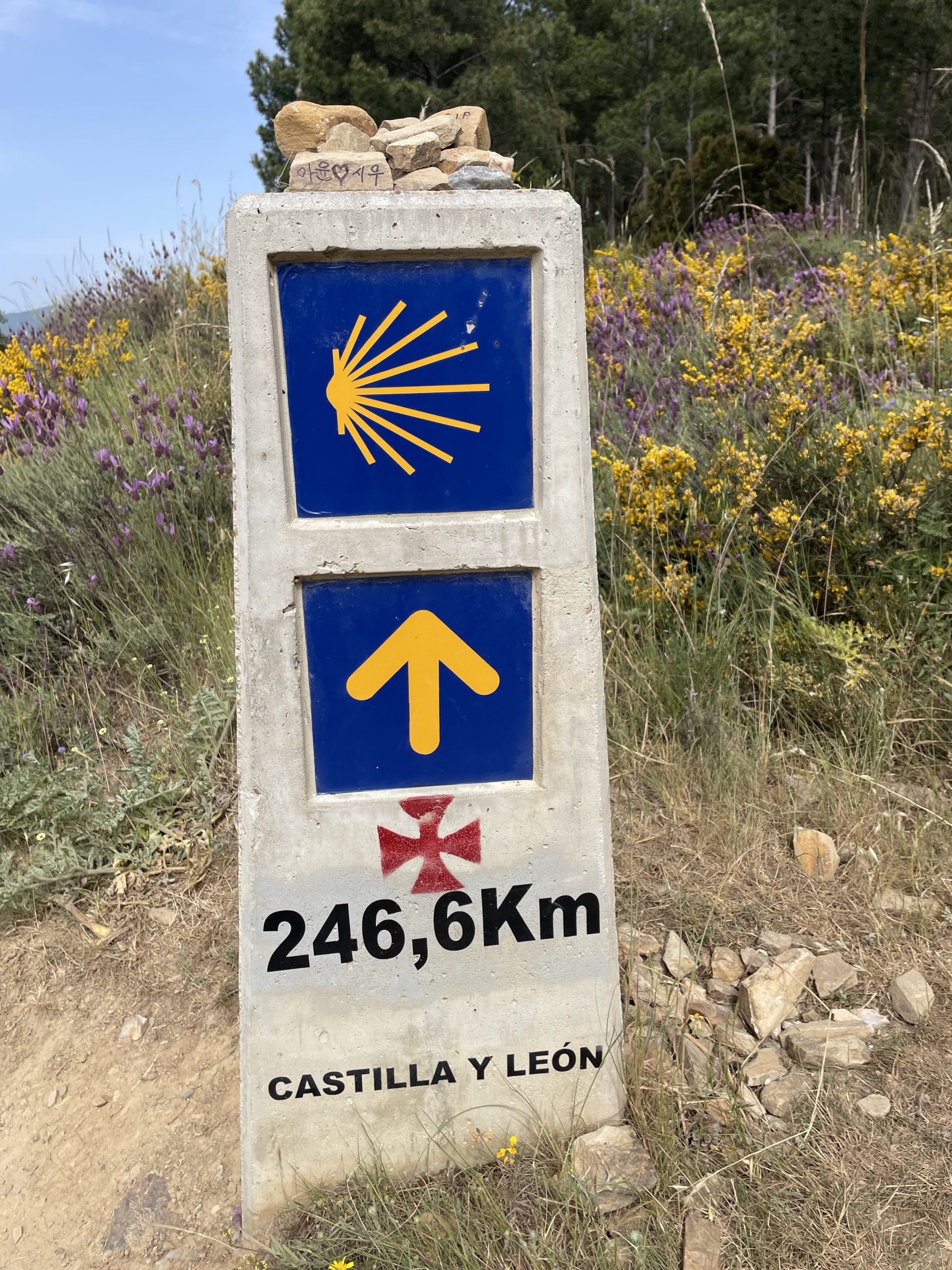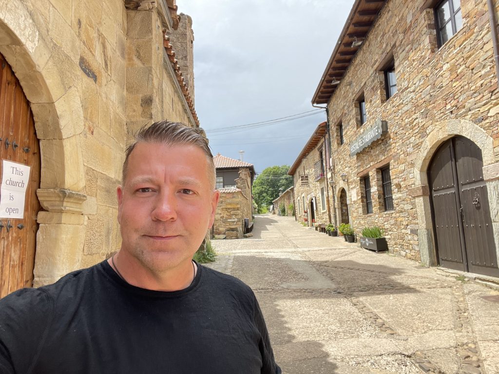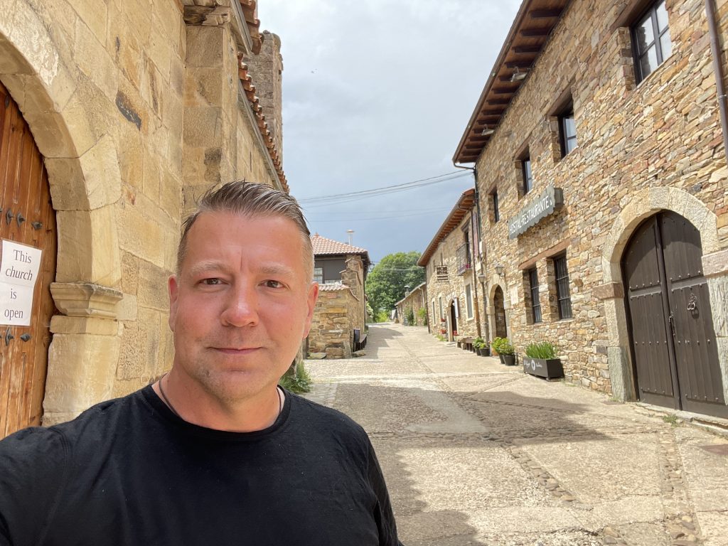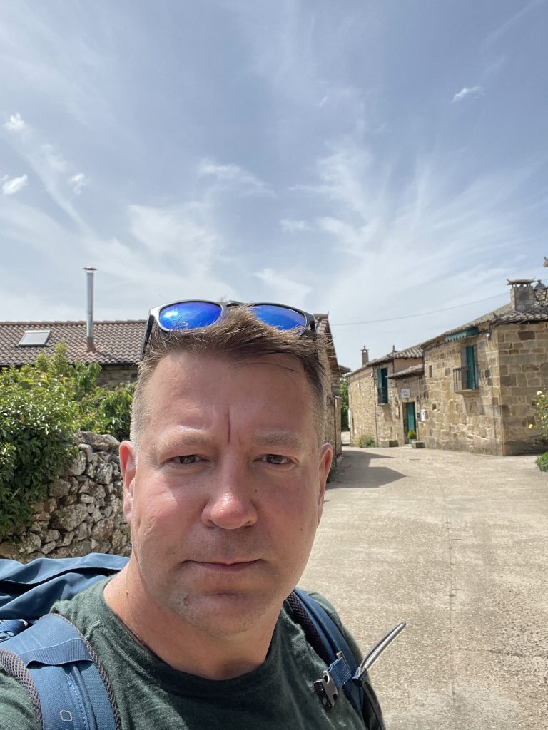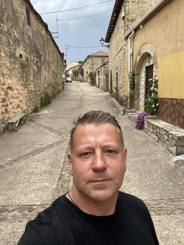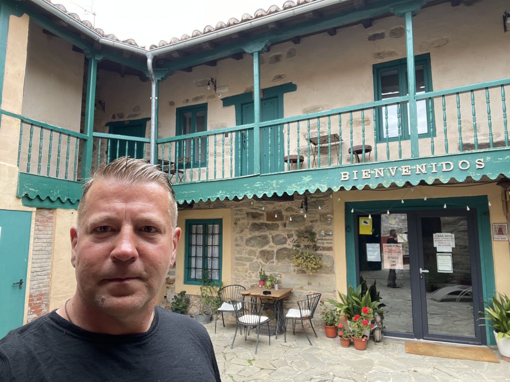 Astorga hat mir aus irgendeinem Grund nicht so gut gefallen, kann gar nicht den Grund benennen. Bin nach einem doch noch geselligen Abend früh ins Bett mit nur Frauen im Schlafraum, außer mir halt. Die sind dann alle schon um 05.00 Uhr aufgestanden und haben sich auch redlich bemüht leise zu sein, das muss ich ihnen lassen. Bei einem alten Boden aus Holzdielen aber ein Ding der Unmöglichkeit. Also bin ich auch früh raus und um 06.30 Uhr on the way. Nach 4 KM in die erste Bar am Wegesrand, dort traf ich Patricio wieder und lernte Savanna aus Frankreich kennen. Sie kommt aus Ardeche. Sie konnte kein Englisch und ich kein französisch. Egal, haben uns trotzdem gut verstanden. Die Bar offerierte einen unglaublich gutes Tortilla mit Frischkäse und Bacon drauf. Tortilla meets Flammkuchen. Lecker. Ich bin dann heute schon um 12.30 Uhr angekommen und habe ein kleines, echt schnuckeliges Zimmer in einem alten steinernen Wohnhaus mit herrlichem Innenhof. Im Bad hängt ein selbst geknüpfter Vorhang mit der deutschen Aufschrift:“ Freut euch des Lebens“. Und das hier in einem kleinen, spanischen Bergdorf auf 1000m Höhe. Einzigartig. Ich fühle mich sofort pudelwohl hier und spiele mit dem Gedanken eine Tag zu verlängern. Der Oberschenkel und mittlerweile auch die Wade wären sicherlich dankbar. Beim Rundgang durch das Dörfchen, bin ich in die kleine Kirche rein. Sie war nicht spektakulär, strahlte jedoch wesentlich mehr Ruhe, Erhabenheit und Spiritualität aus als die auf Prunk ausgerichteten Kathedralen in Burgos oder Leon. Ich war allein dort, im Hintergrund wurde gregorianischer Gesang angespielt. Ich habe mich in einer der Bänke gesetzt und diese unvergleichliche Atmosphäre aus Stille und Spiritualität länger auf mich einwirken lassen. Es nimmt einen schon mit. Um 19.00 Uhr besuchte ich die Messe, die in Latein und mit gregorianischen Gesängen zusammen mit den Pilgern abgehalten wurde. Ich kannte das in der Form noch nicht. Es war meditativ, schön. Auch, wenn ich kein Wort verstanden habe.