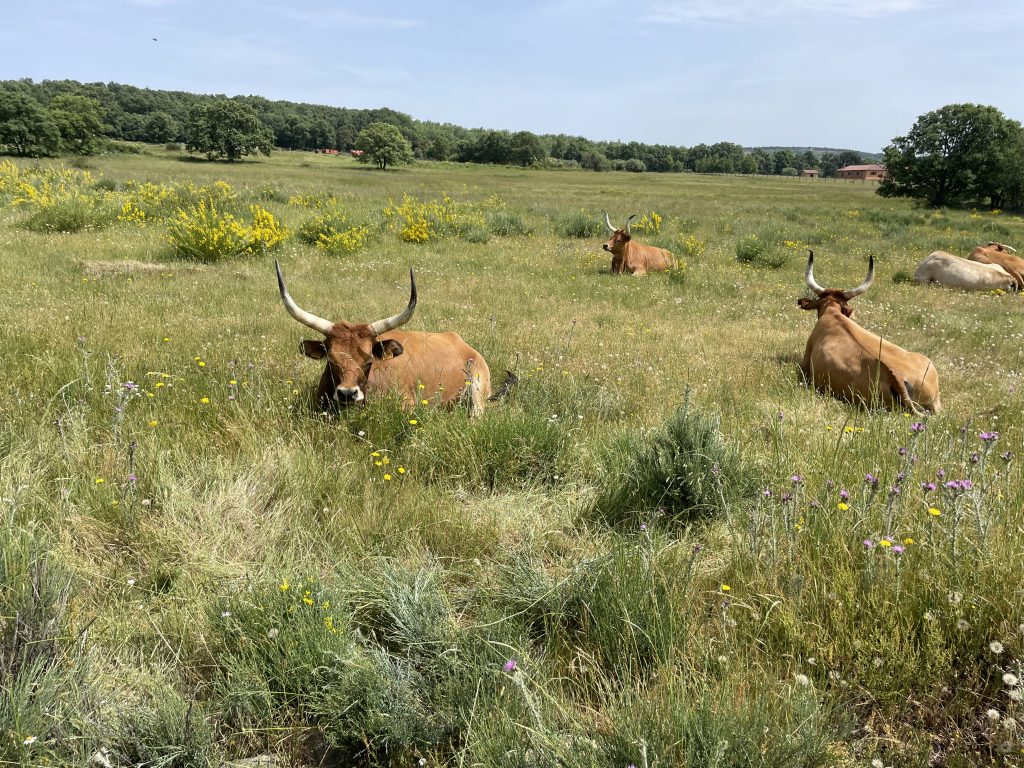 Die 30 Grad halten sich beharrlich, auch wenn sich die Sonne aufgrund der leichten Bewölkung erst am Vormittag durchsetzen konnte. Die Landschaft heute war wunderschön. Hügelig, endlich wieder Wald ab und zu und ansonsten wie die Lüneburger Heide, nur höher gelegen, insgesamt gemütliche 21 KM bei 300 Höhenmetern.