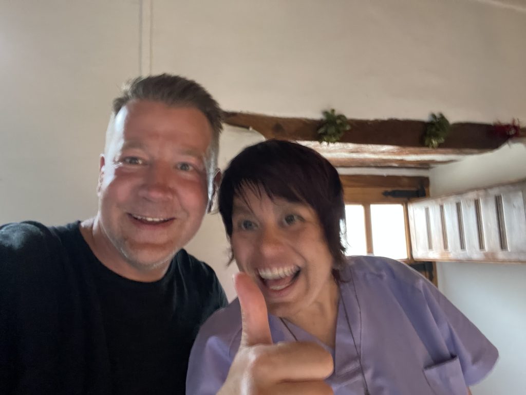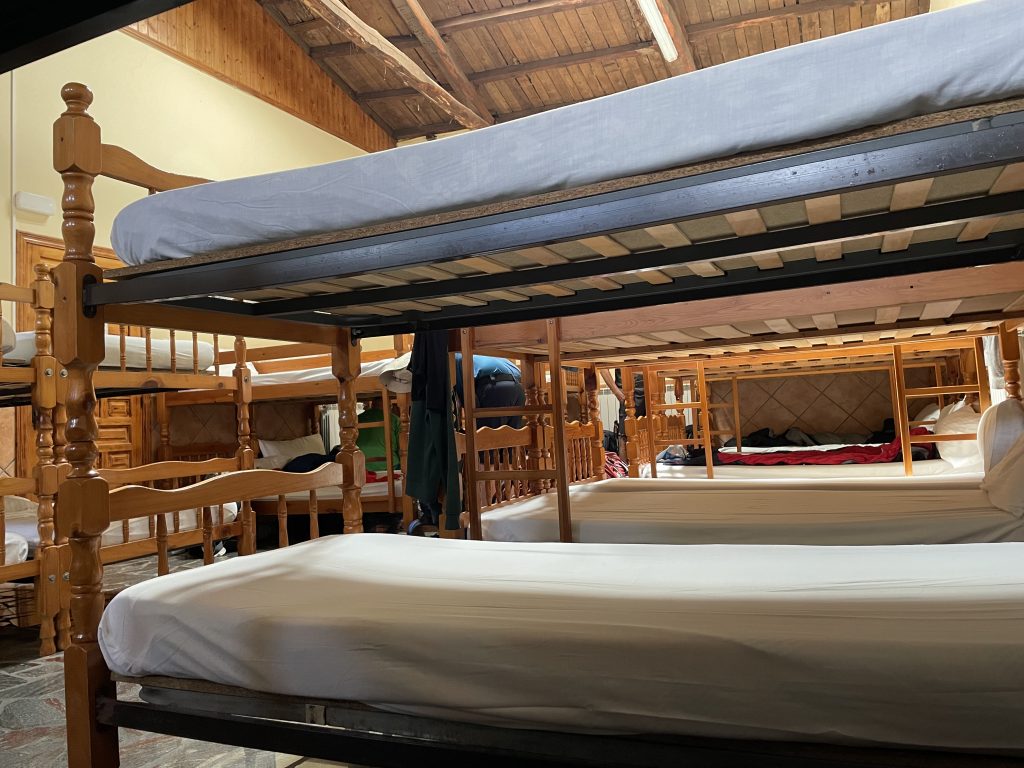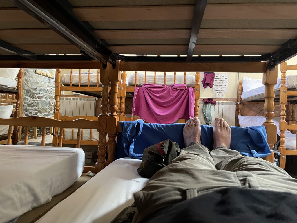 Ich bleibe noch einen Tag, ist halt so schön hier. Gute Entscheidung, zu der ich mich bei einem entspannten Café con lesche selbst zufrieden beglückwünsche. Tut mir, meinem Oberschenkel und der Wade gut. Ausgeschlafen musste ich um 10.00 Uhr mein kleines Refugio verlassen, leider konnte ich nicht verlängern und laut Booking.com ist alles in Rabanal ausgebucht. Bekomme heute morgen glücklicherweise eine WhatsApp von Alba, der Vermieterin:“Do you still need a room“. Jo, doe ich. „I have one with shared bathroom in another albergue“.“ „I take it and muchas grazias“. Cool. Die Herberge ist nur 70m weiter und sieht von außen toll aus. Zimmer für mich zum Ausruhen, gemeinsames Bad ist nach den Herbergserfahrung kein Ding. Bekam dann auch mein „Zimmer“, gemeinsam mit 30 anderen Pilgern in einem riesigen Schlafraum. Das bathroom besteht aus einem Klo und zwei Duschen, das ich mir mit 30 anderen share. Davor gibt es wenigstens eine Sitzbank, sollte es zu Wartezeiten kommen.😂. Die Etagenbetten sind dicht an dicht gestellt und somit eigentlich Doppeletagenbetten. „Say hello to your unknown bed neighbor“. Anstelle eines Lattenrostes liegt ein dicke Spannplatte drauf und die Matratzen sind dünn. Kostet dafür auch nur EUR 10. Man soll ja dankbar sein, oder so. Da werde ich ja fast neidisch auf die Bretterbude der Australier. Zum Ausgleich könne ich mir heute eine volle Stunde Ganzkörpermassage bei Bea. Und da ich nun im dritten, also dem spirituellen Part meiner Reise angelangt bin, hatte diese Massage auch eher ein esoterischen Touch mit Klangschalen und was so dazugehört. War angenehm. Lustig war der Einstieg, da Bea kein englisch spricht, hat sie in eine Übersetzungsapp gesprochen. Diese sagte dann zu mir:“ Entblöße dich und leg dich hin.“. Klang irgendwie komisch. Aber na gut, Hauptsache der Butterfly kann morgen wieder fliegen😉