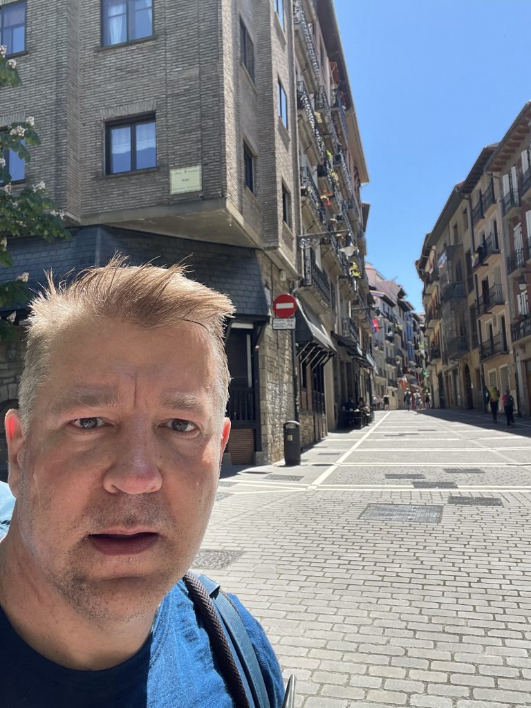 Harpe Kerkeling hat in seinem Buch geschrieben, der Weg nimmt dir alles und gibt es dir dreifach zurück. Zumindest den ersten Teil der Aussage kann ich erahnen. Der vierte Tag war schon sehr anstrengend, da der Körper sich noch nicht an das Gewicht des Rucksacks und die Belastung gewöhnt hat. Kann auch trotz des frühen Aufstehens und der täglichen Wanderung schlecht einschlafen. Ob das am dänischen Sägewerk lag oder daran, dass der Kreislauf auch abends noch auf Hochtouren läuft, kann ich nur spekulieren. Bin heute zusammen mit den anderen aufgebrochen, wollte dann aber lieber allein laufen. Wie es auf dem Camino so ist, man trifft sich immer wieder und heute haben wir alle Betten nebeneinander und schauen uns gleich noch Pamblona an.Heute den ganzen Tag blauer Himmel und Sonnenschein bei angenehmen 22 Grad. Stimmung ist gut, davon überzeuge ich jetzt noch meinen Körper.