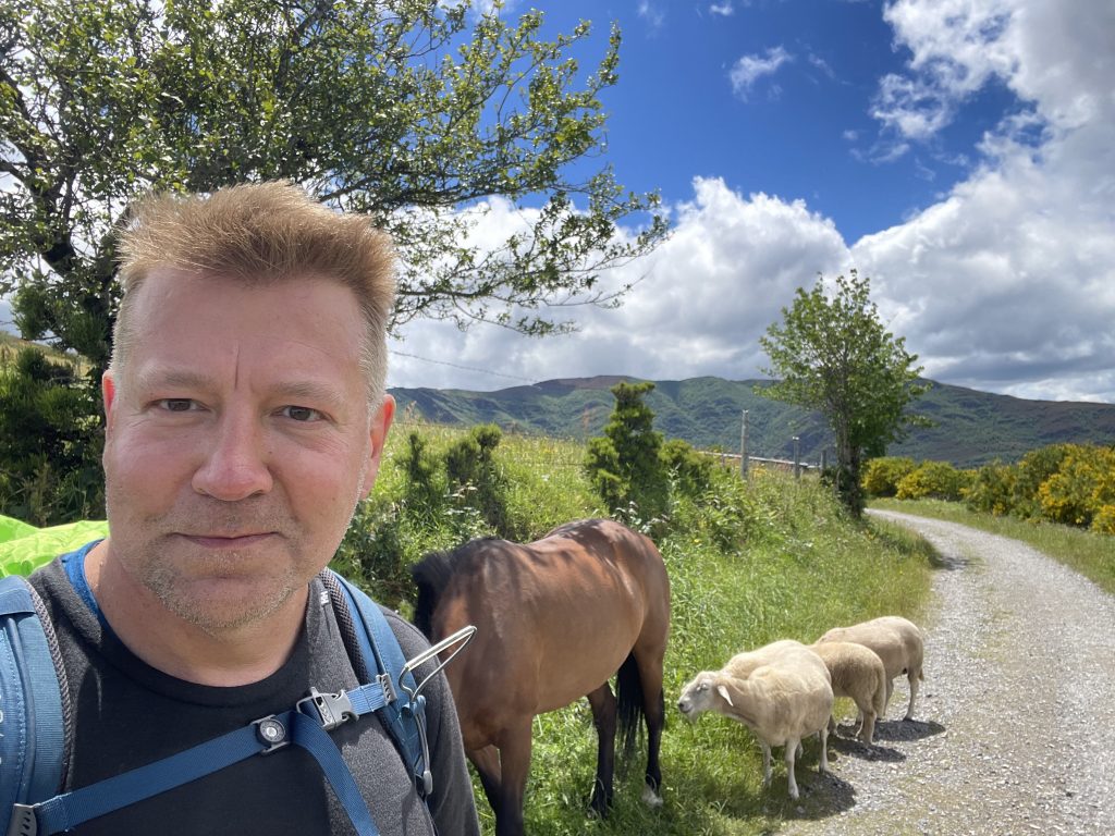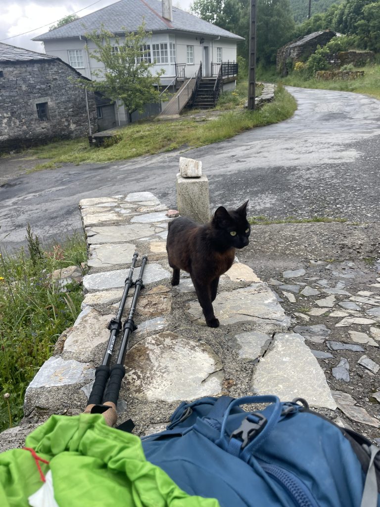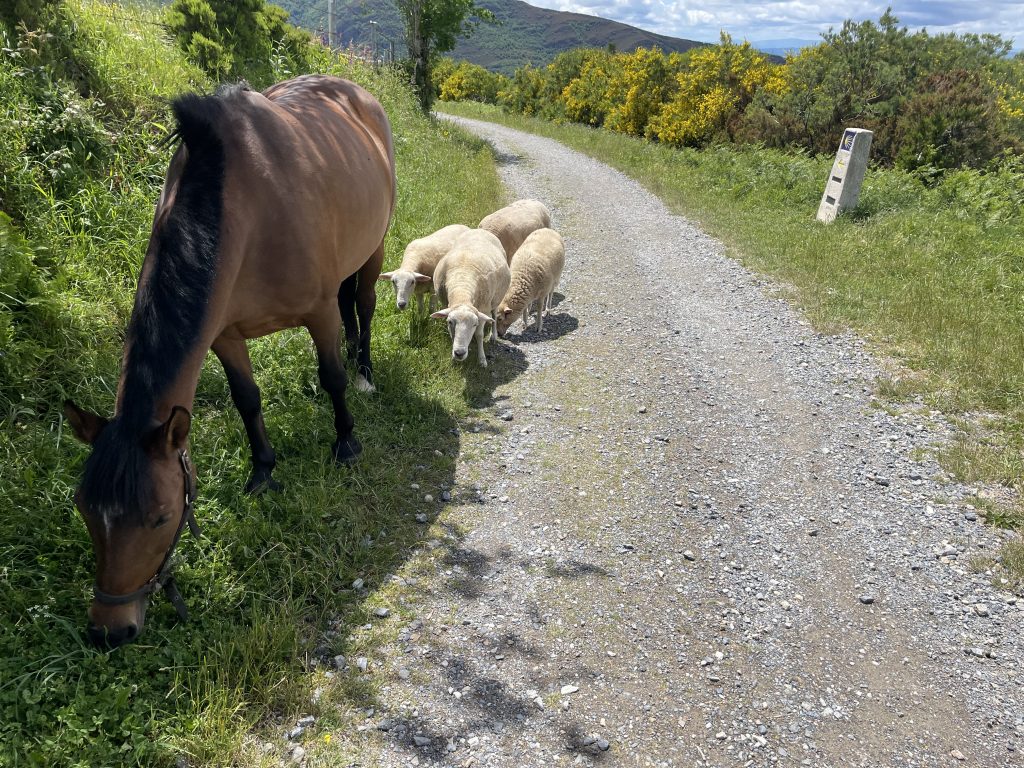 Heute ging es von dem hochgelegenen O Cebreiro (1.300 Höhenmeter) ins tiefergelegene Triacastela (700 Höhenmeter über insgesamt 21 KM. Der Tag begann regnerisch, kalt und windig. Das sollte sich auch den Vormittag halten bis später wieder die Sonne rauskam. Ein kleiner Vorgeschmack auf das Klima in Galizien. Dafür waren es tolle Momente in den Bergen mit einzigartigen Ausblicken in einer vor grün strotzenden Natur.