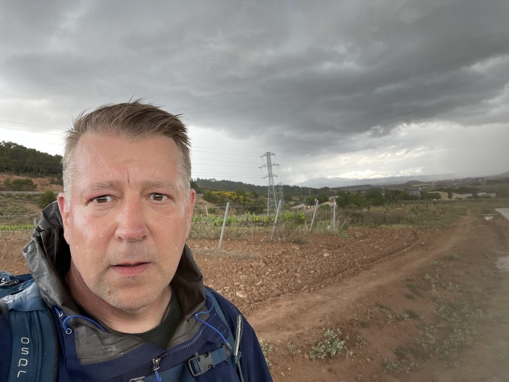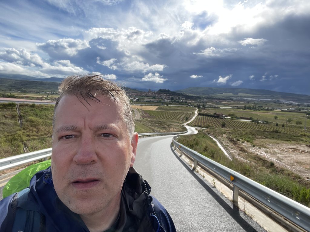 10 Stunden geschlafen. Herrlich, obwohl meine Stimmung ein wenig gedämft ist in dem Wissen, dass die anderen ohne mich weiterziehen. Es war ein sehr emotionaler Abschied mit gant vielen „Huges“ und dem ehrlichen Angebot, dass wir uns jederzeit besuchen, sollte mal jemand zufällig in Kanada, Dänemark oder Deutschland sein. Es ist schon unglaublich, wie schnell man Vertrauen und eine Bindung zu Menschen aufbaut, die man nur kurz kennenlernen durfte. Ich werde euch vermissen. Donna, ein toller Mensch, die mir beim Zuprosten immer tief in die Augen blickte, als ich sie darüber aufgeklärt habe, welches Risiko die Deutschen reininterpretieren, wenn man es nicht macht. Nancy, die alles für uns übersetzen konnte, sogar koreanisch und ein breiteres Englisch spricht, als ich es je von einem Südstaatler gehört habe (sie ist Deutsche). Steffen, ein ganz ruhiger Mensch, der stets im Hintergrund alles organisiert hat und wunderbar Gitarre spielt. Dein Solo mit Gesang:“Freude schöner Götterfunken“ hat mich in den Bann gezogen. Danke für diesen MOMENT. Luci, eine junge, sehr ausgeglichene, intelligente Frau, die ihren Weg machen wird. Ich wünsche dir nur das Beste für deinen Start als Lehrerin. And last but not least meine kleine, dänische Kreissäge. Ich werde unsere Gespräche vermissen, allerdings nicht den einseitigen Kreissägenmonolg in der Nacht. Ihr seid eine bunt zusammengewürfelte, geile Truppe aus allen herren Länder. Und ich vermisse euch jetzt schon, aber meine Freiheit und Flexibilität sind mir wichtiger. Thx so much for my wonderful birthday. I hope we will see eachother again in Santiago!!!!!! Heute Morgen habe ich festgestellt, dass ich meine Aufladkabel in Los Arcos vergessen habe. Na toll. Wenigstens gibt es hier einen Media Markt, der hat aber sicherlich kein Kabel für meine Garmin Uhr. Dann also wieder zurück, hab ja Zeit. Google navigierte mich zur Busstation, dachte ich. Weit und breit keine Busstation zu sehen. Google ist den Camino anscheinend auch noch nicht gelaufen. Ich muss wohl sehr hilflos gewirkt haben, da mich sofort zwei Spanier ansprachen, ob ich Hilfe bräuchte. Ja, sehr gern sogar. Sehr freundliche Menschen, die Spanier. Sie zeigten mir dann den richtigen Weg. Also Ticket gekauft, um 13.00 Uhr los, 13.35 Uhr angekommen, Dafür habe ich gestern über 8 Stunden gebraucht. Kabel geholt (hatte vorher in der Herberge angerufen) und um 14.50 Uhr wieder zurück nach Logrono. Während ich auf den Bus wartete blieb noch Zeit für ein Mittag und ich konnte mein Handy in der Bar wieder aufladen. Was man nicht im Kopf hat… Was hätte ich auch sonst mit meinem freien Tag anstellen sollen? Passiert mir nicht nochmal. Noch eine Nacht werde ich nicht in Logrono verbringen. So schön ist die Stadt nicht. Ich laufe heute nur 13 Km nach Navarrete, da ich erst um 16.00 Uhr starten kann. Damit das ein wenig schneller geht, habe ich dem Drecksack eine Radikaldiät verpasst. Heute Morgen habe ich nochmal alle Sachen auf dem Prüfstand gestellt und nur das behalten, was ich wirklich brauche. Den Rest habe ich heute morgen nach Hause geschickt. Für 30 EUR Porto ein Schnapper. Hätte die Sachen auch einfach da lassen können, wäre nicht teurer gewesen. Egal, der Drecksack wiegt jetzt 1,6 Kg weniger. Erstaunlich und trägt sich viel befreiter. 13 KM mach Navarette ist doch mittlerweile ein Katzensprung, dachte ich. Die ersten Kilometern gingen flott, dann erwischte mich im den Weinbergen ein heftiges Gewittern. Es krachte direkt über mir so heftig, dass ich zusammenzuckte und lieber Schutz am Wegesrand suchte. Es schüttete wie aus Eimern bis der Regen in Hagel überging. Ich musste feststellen, dass meine regendichte Jacke nicht so regendicht ist wie der Preis es vermuten liesse. Ich war klitschnass bis auf die Unterhose bis die Sonne sich wieder etwas blicken ließ und ich weiter konnte. Ich musste feststellen, dass ich den Drecksack auf einen Lehmhaufen deponiert habe, also erstmal Schlamm abklopfen, obwohl er es nicht verdient hat. Hatte noch Lehmreste an der Hand. Hmh, Lehm roch in meiner Erinnerung nicht so streng. Oh Nö. Zum Glück hatte ich noch Feuchttücher dabei, die der Radikaldiät nicht zum Opfer gefallen sind. Na wenigstens habe ich trockene Füße, dachte ich. In einer Senkkuhle hat sich das Wasser knöcheltief gestaucht und links oder rechts war kein Vorbeikommen. Na denn halt mitten durch. Gorotex hilft übrigens nicht gegen Nässe, wenn man knöcheltief in der Brühe steht. So ging es dann Pitsche, Patsche die letzten Kilometer nach Navareette. Läuft heute😂💪. Angekommen, brauchte ich noch eine Unterkunft. Ich wollte nur eine warme Dusche und ging ins erstbeste Hostel. Nein, ein Bett hätten sie nicht, nur ein Zimmer für EUR 30. Wie geil. „Ja nehme ich. Konnte es gar nicht schnell genug aussprechen. Sehr schönes Zimmer in einem dieser typischen, mittelalterlichen Dörfer mit einer überdimensionalen Kirche direkt gegenüber. Sehr schön, wenn die nicht alle Augenblicke bimmeln würde. Direkt gegenüber ist eine Tapas Bar. Das Essen ist zum Miederknien. Habe mir eine heiße Knoblauchsupoe bestellt. Schlaf ja allein. Hier hole ich jetzt meinen Ruhetag nach. Die Schuhe werden bis morgen eh nicht trocken. Ende gut, alles gut.