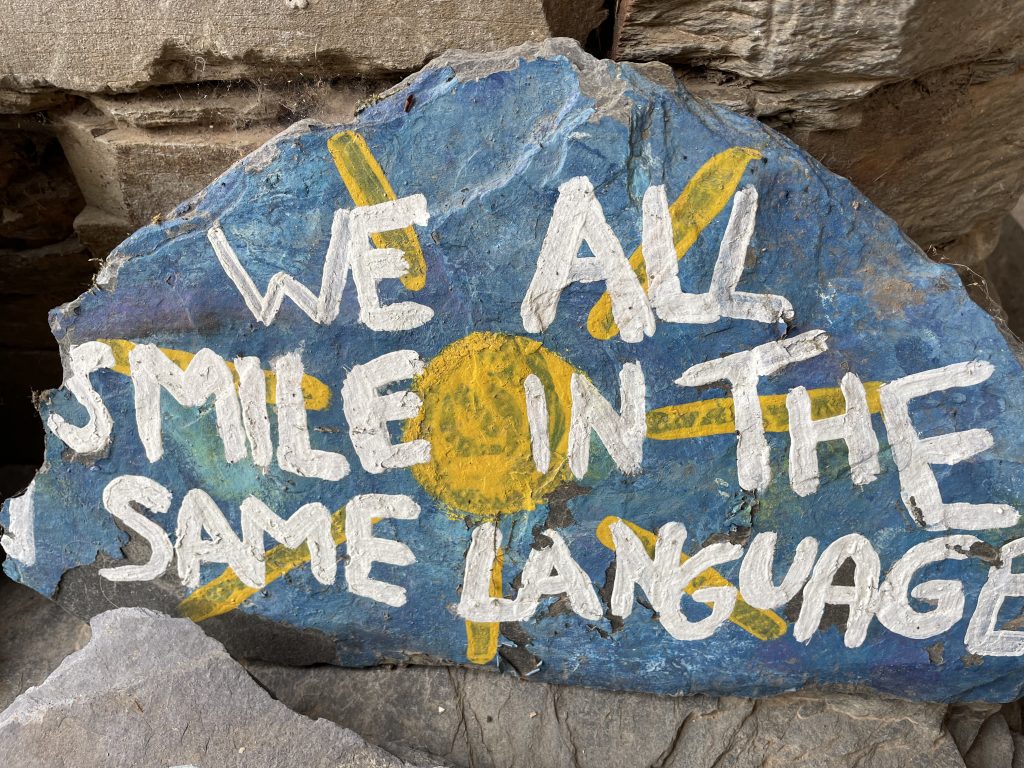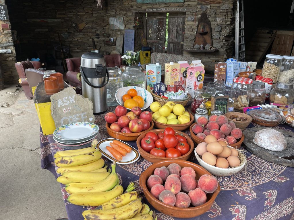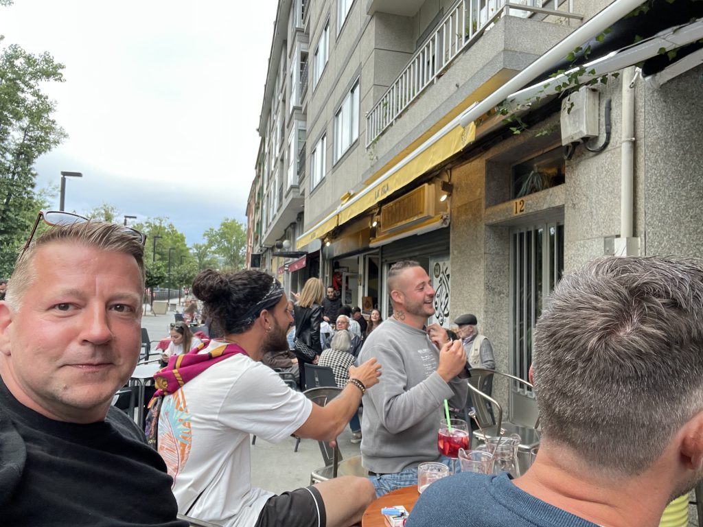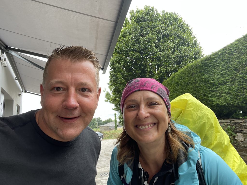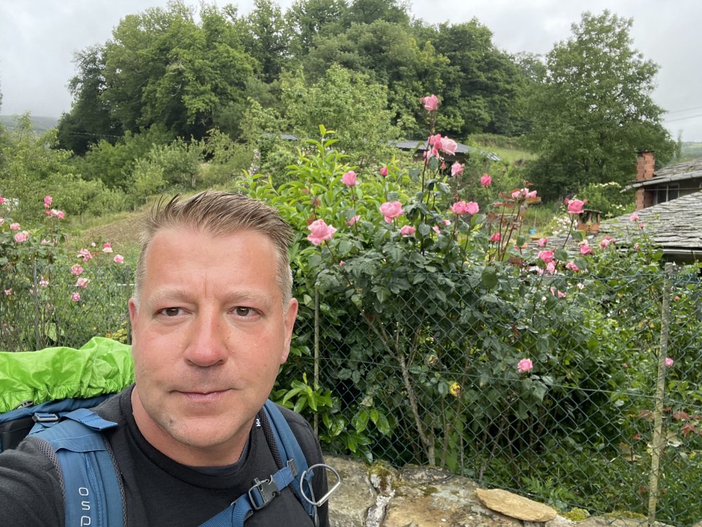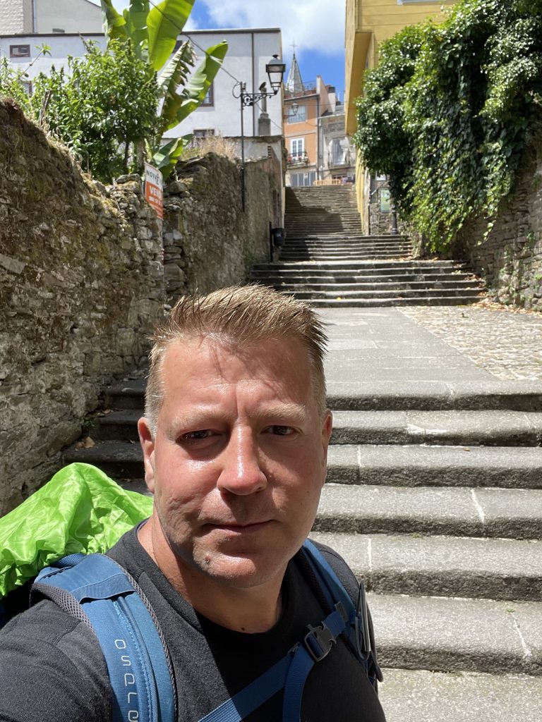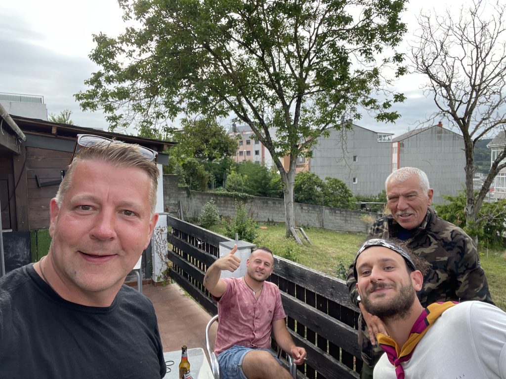 Ich hatte ein kleines Einzelzimmer und bin nach den gestrigen 5:1 guter Stimmung und halbwegs ausgeschlafen. Die mystische Landschaft ist schon beeindruckend, so ganz anders als die karge Meseta. Auf meinen Alternativweg gibt es die ersten 11 KM keine Bar zum Frühstücken. Zum Glück habe ich immer ein paar Nüsse als Notreserve. Laufen ohne Energie hatte ich schon und heute ist keine Eve mit einem Kitkat in Sicht. Hinter einer Kurve steht auf einmal ein reich gedeckter Tisch mit Obst, Brot, Marmelade, gekochten Eiern und alles for free. Cool. Geben ist seliger denn nehmen. Als ich mich setze, kommt eine freundliche Frau aus dem Haus und fragt mich, ob ich einen heißen Kaffe haben möchte. Möchte ich und bin dankbar für dieses unerwartete Geschenk. Ich bekomme sogar noch ein Stück selbstgebackenen Kuchen dazu und alles noch mit einer Blüte dekoriert. Nebenan ist ein Raum zum Meditieren, wenn man möchte. Ich fühle mich wohl an diesem Ort und lerne Simona aus Rumänien kennen und wie gehen die nächsten 5KM gemeinsam bevor uns unsere Wege trennen, da ich mir eine galizische Gemüsesuppe in der nächsten Bar bestelle und sie weiter möchte. Sarria gefällt mir gut, die galizische Küche sowieso. Angekommen lege ich mich erstmal für 2 Stunden hin. Bin doch wohl müder als ich gedacht habe. Danach schaue ich mir die Stadt an und lande in einer Bar, die Fussball zeigen. Ach ja, heute spielt ja Spanien. „Hey man“, sagt jemand mit keltischem Akzent. John aus Irland und Bart aus Belgien sind auch da. Wir schauen das Spiel. Dabei lerne ich Dan aus Kanada kennen, der nun in Madrid lebt. Er hat einen deutschen Pass, spricht aber kein Wort deutsch. Seine Großmutter ist in Berlin aufgewachsen und in den 30er ins Ausland geflohen. Er ist Englischlehrer und begleitet eine Schulklasse auf dem Weg nach Santiago. Später lerne ich noch Luke und Christopherus aus Italien kennen. Wir sind uns einig darüber, dass die Europawahl in die falsche Richtung lief. Empfinden uns als Europäer und sind uns sympathisch. Ich schaue mir ihnen das Italienspiel und er ist so nett das Spiel von 2006 nicht zu erwähnen. Dafür bin ich dann auch für Italien.