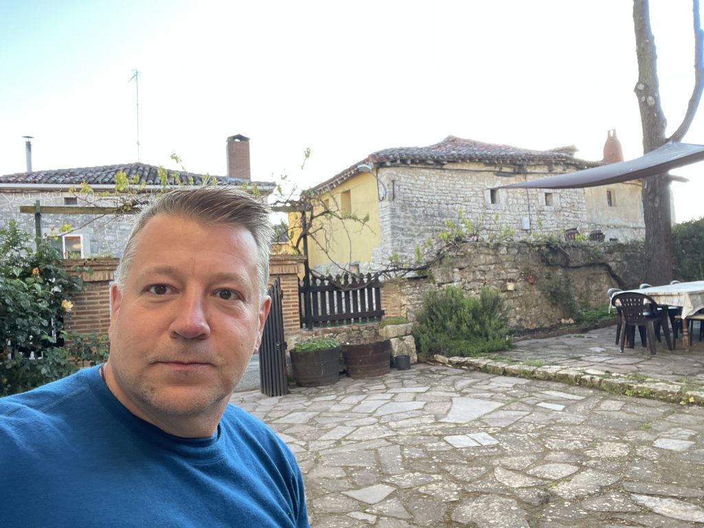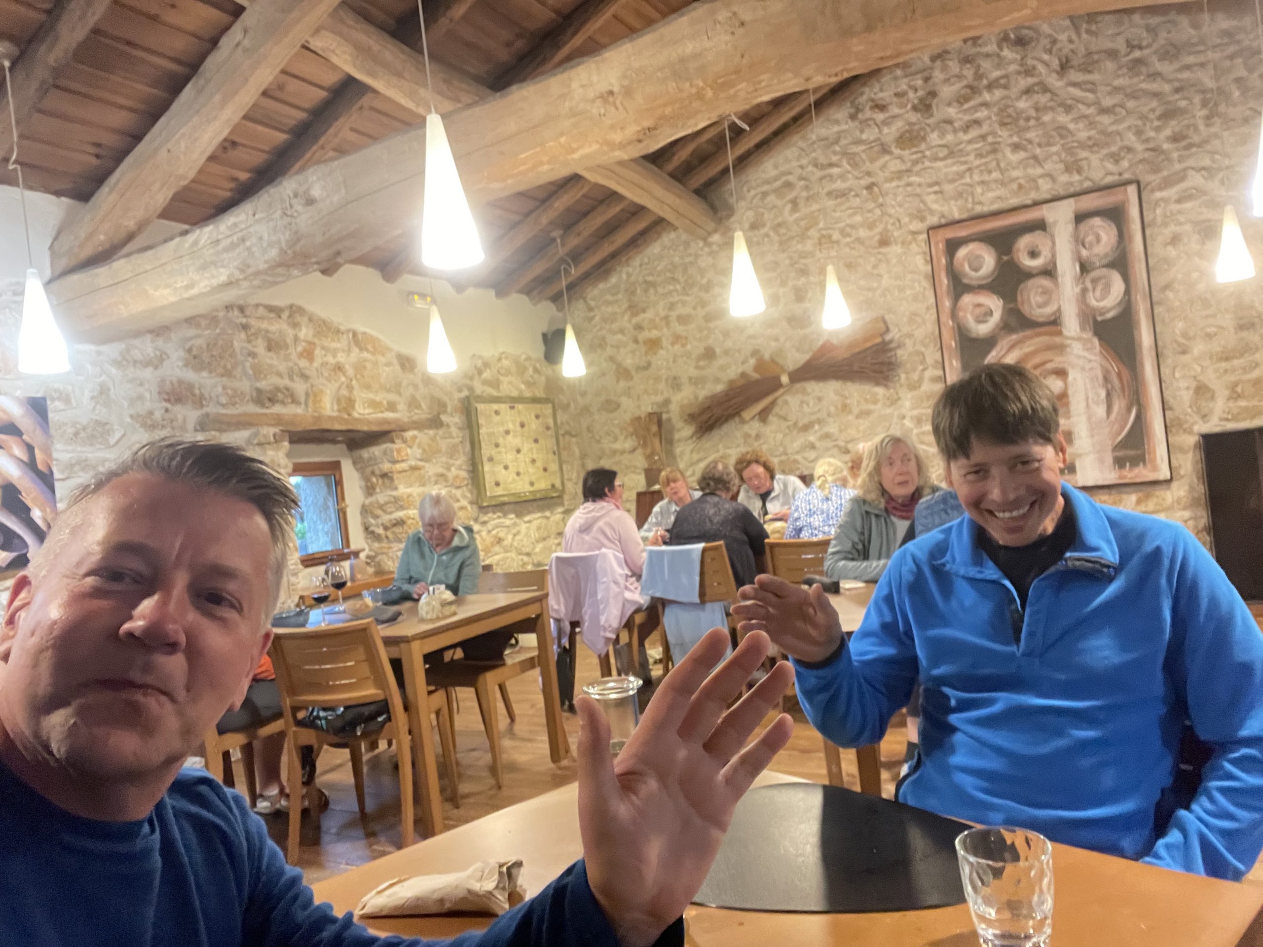 Gestern war es eine sehr herzliche Runde. Alle sassen vorm Kaminfeuer. Ich weiss, es ist Ende Mai, aber es ist kalt hier. Einer hat Baguqette getoastet und es mit Olivenöl rumgereicht. Der andere hat eine Chorizo angeschnitten und es ihm gleich getan, dabei wurde von irgendwoher eine Weinflasche rumgereicht und gemeinsam den Abend in einer Runde von unterschiedlichen Leuten mit einem gemeinsamen Verständnis gelebt. Offen, ungezwungen und ehrlich. Eine sehr erfüllende Erfahrung. Um 19.30 Uhr gingen wir dann ins Restaurant. Diese ist ein kleines Dörfchen mit ein paar Häusern, aber die Küche ist hohes Niveau. Und das alles für EUR 22 inkl. Wein. Ich hatte als Vorspeise gegrillten Ziegenkäse auf einer Apfelscheibe in einem Salatbett. Boh, wat lecker. Ich habe den Abend mit Dwain, einem Kanadier aus Vancouver verbracht, da wir unsere Tische nicht zusammenstellen durften, warum auch immer. Er hatte eine schwere Krebskrankheit hinter sich. Und bevor er weiter vor dem Fernseher sitzt, geht er lieber den Camino, sagte er mir. Es war sehr unterhaltsam und tiefgründig mit ihm. Er bestellte eine Art von Tacos. Ich fragte ihn, was die typischen, kanadische Küche sei. „ Burger, Pasta und ein paar Fischgerichte“. Na denn…. Um 22.00 Uhr ging es wie immer ins Bett. Übrigens ist Atapuerca weltbekannt, wurden hier doch die ältesten, humanoiden Fossilen außerhalb Afrikas gefunden. Der älteste bekannte Europäer ist somit 1,4 Millionen Jahre alt.