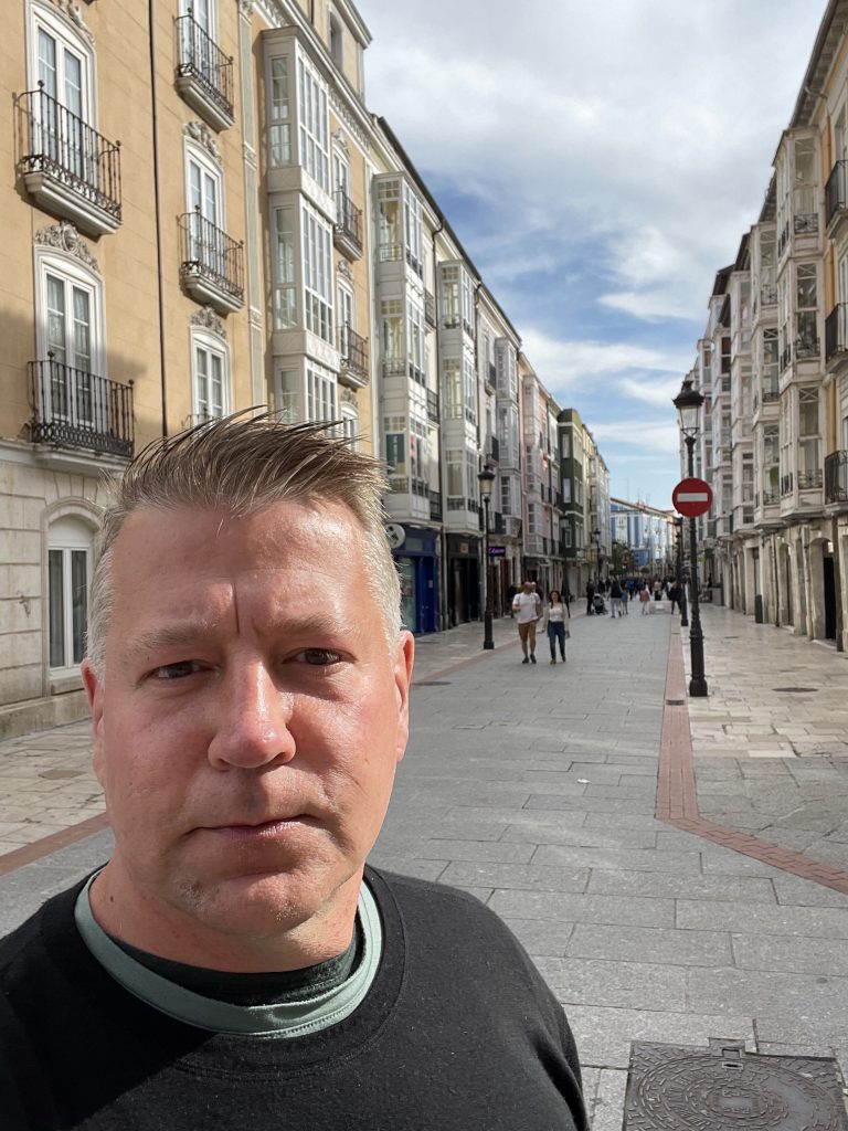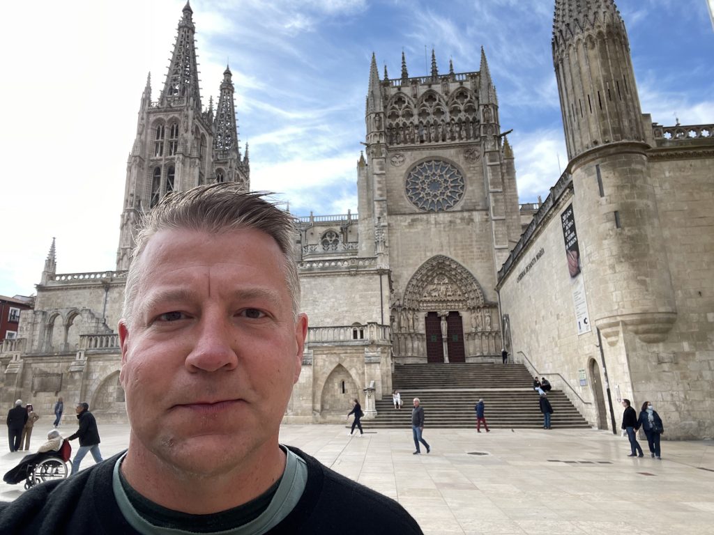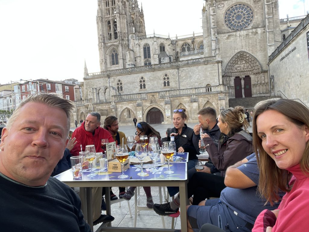 Endlich. Endlich blauer Himmel und Sonnenschein. Heute Morgen um 8.00 Uhr nach einem kleinen Frühstück in der tollen Albergue losgewandert. Der Weg führte 21 KM oder 6 Stunden nach Burgos. Die zunächst schöne Landschaft wurde durch die triste und öde Vorstadt von Burgos abgelöst. Typisches Industriegebiet eben. Musste noch einen vielbefahrene, 4spurige Stadtautobahn überqueren, bevor ich auf der richtigen Seite war. Ich sollte aber nicht enttäuscht werden. Ich bin froh und glücklich, dass ich nun erstmal Verschnaufpause habe. Burgos ist toll und bin sogar einen Tag früher angekommen als geplant. Konnte zum Glück mein vorgebuchtes Appartment (mitten drin) einen Tag vorziehen. So bleibe ich jetzt bis Sonntag hier. Und die Sonne bleibt bei mir in den nächsten Tagen. Schöne Aussichten. Mein Schienbein und ich haben das auch dringend nötig. Ist zwar besser geworden, aber immer noch nicht schmerzfrei und nach 20 Km merke ich es. Es ist weiterhin angeschwollen und warm, d. h. die Entzündung ist noch da. Egal, habe jetzt ja Ruhepause. Die Innenstadt von Burgos ist wunderschön. Viele, kleine Gässchen, die zum Erkunden einladen und immer wieder tolle Plätze mit unzähligen Cafés und Bars. Hier kann ich es 3 Tage aushalten. Ich habe mir dafür diesmal ein kleines Appartment gemietet, direkt davor kniet ein Spanier in betender Haltung und bittet um eine kleine Soende, hab ihm was gegeben und er strahlte. Mein erster Weg nach einem zweistündigen „Mittagsschlaf“ führte mich zu der bekannten Kathedrale von Burgos. Die hatte leider schon geschlossen, dann halt morgen. Dort traf ich die anderen von gestern wieder und wir hatten abermals eine tolle Zeit. Es gesellten sich immer mehr Pilger zu uns. Claire aus Brighton, Tana aus Australien, John aus San Diego, David aus Jamaica, Stephan aus Frankreich, Jens als einziger Deutscher, usw. Anschließend sind wir noch mit 15 Leuten gemeinsam essen gegangen. Es war wieder herrlich offen und international. Ich unterhielt mich länger mit Tana aus Australien. Europa ist ihm etwas zu kalt, aber er liebt dieses pulsierende Leben. „For you Thursday is like for us Saturday.“ Er dachte erst die Menschen in Europa wären kühl und abweisend. Er erklärte mir, wenn du erstmal die „border“ überschritten hast, sind die Europäer warmherzig und hilfsbereit. Nicht so oberflächlich wie bei ihm zu Hause. Das war das erste Mal, dass ich mich wirklich als Europäer gesehen habe und stolz drauf war.