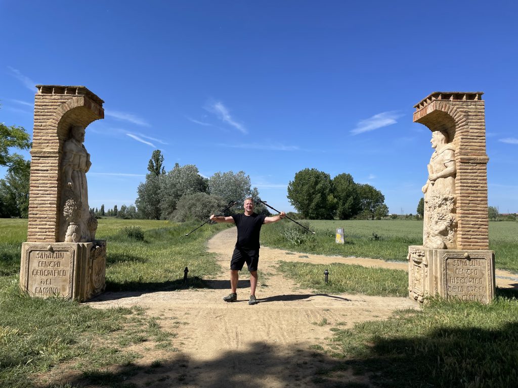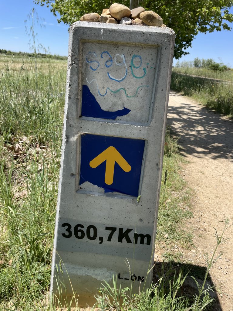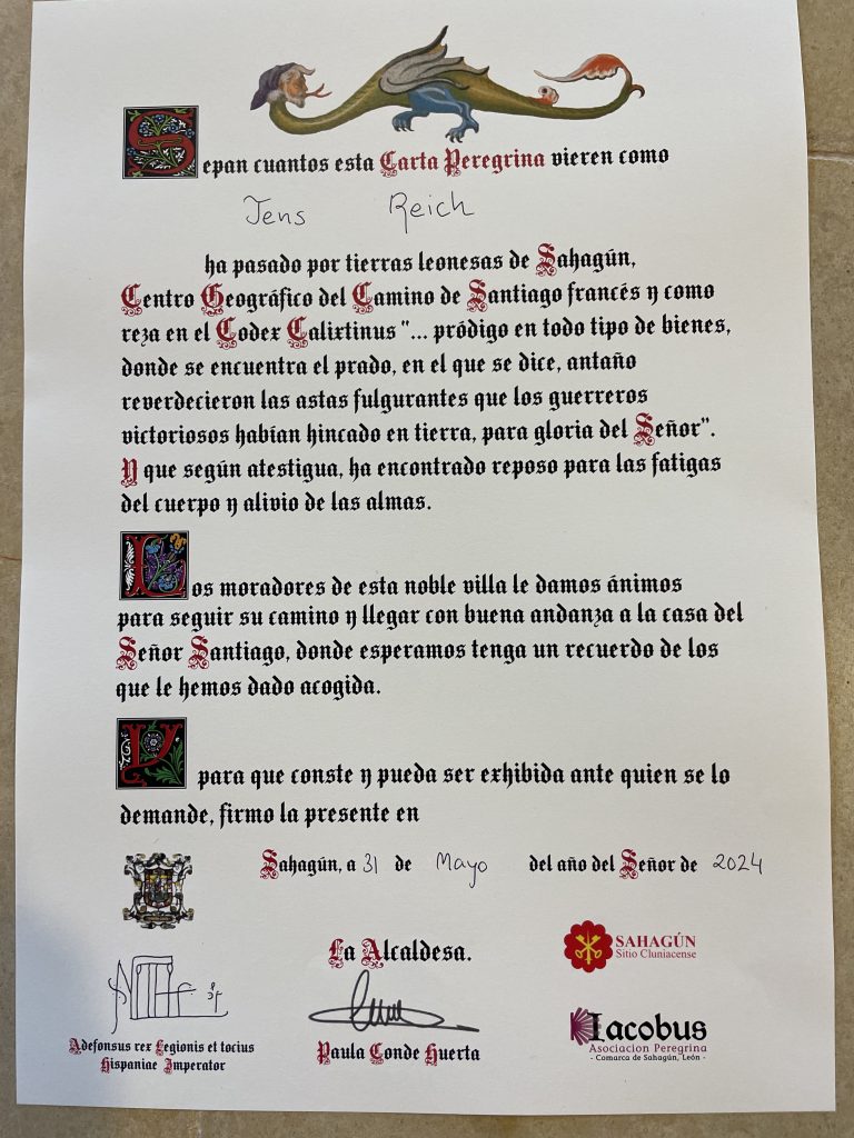 Der Titel des heutigen Tages sollte eigentlich „Halftime“ lauten. Ein anderes Ereignis war mir wichtiger. Dennoch soll es natürlich nicht unerwähnt bleiben. Mit dem Durchschreiten des Tores in Sahagún habe ich die Hälfte der Strecke hinter mir. Unglaublich. Ich gehe kein Risiko ein und lass mir das amtlich in Form eines Pilgerbriefes bestätigen. Wäre ja möglich, dass irgendwann mal jemand beim jüngsten Gericht danach fragt, vielleicht sind damit ja die Hälfte der Sünden erlassen. Das wird für das Himmelreich nicht ganz reichen, aber vielleicht wird das Fegefeuer dann nicht ganz so heiss geschürt. Man muss halt nur feste dran glauben. Es ging heute in 7 Stunden über 26 KM von Ledigos nach Bercianos. Die Strecke war teils schön, teils führte sie an der Autobahn vorbei. Sonnenschein bei angenehmen 22 Grad und erfrischendem Wind. Mit dem Backofen von gestern nicht zu vergleichen.